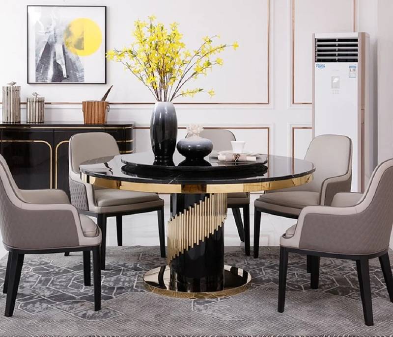 The Addison Round Dining Table by DotFurn features a luxurious black marble top and a sculptural gold stainless steel base — comfortably seating 4 to 6 guests with modern elegance.