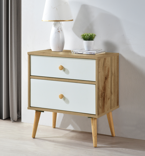 Expertly crafted from foil-laminated particleboard and MDF, the Adriana ensures both durability and style. Its realistic oak-effect finish adds warmth and texture, while the tapered wooden handles provide a soft, elegant touch. Designed for modern living, the two spacious drawers keep your bedside essentials neatly organized — whether it’s your favorite book, tech gadgets, or self-care items.