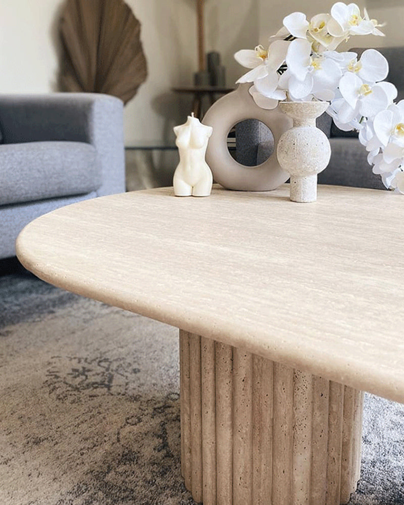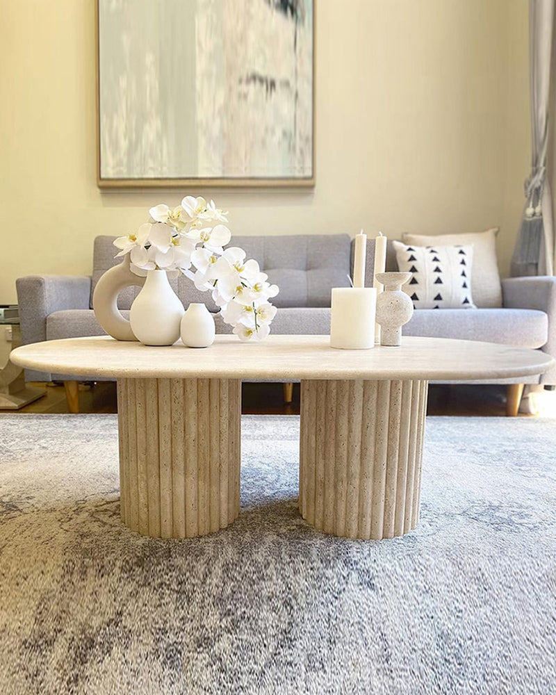 The Asahi Travertine Coffee Table with Fluted Legs by DotFurn is where modern artistry meets timeless elegance.