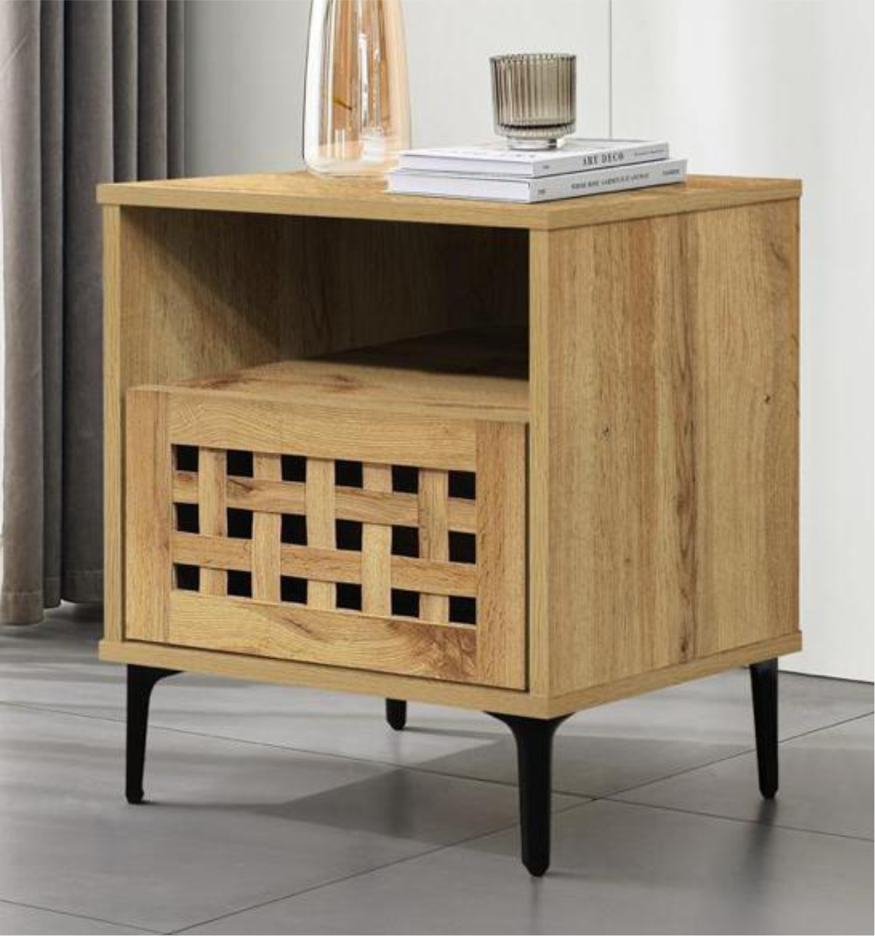 The Ezra Bedside Table – Oak combines modern elegance and function, featuring two drawers, a carved lattice front, and matte-black legs for timeless style.