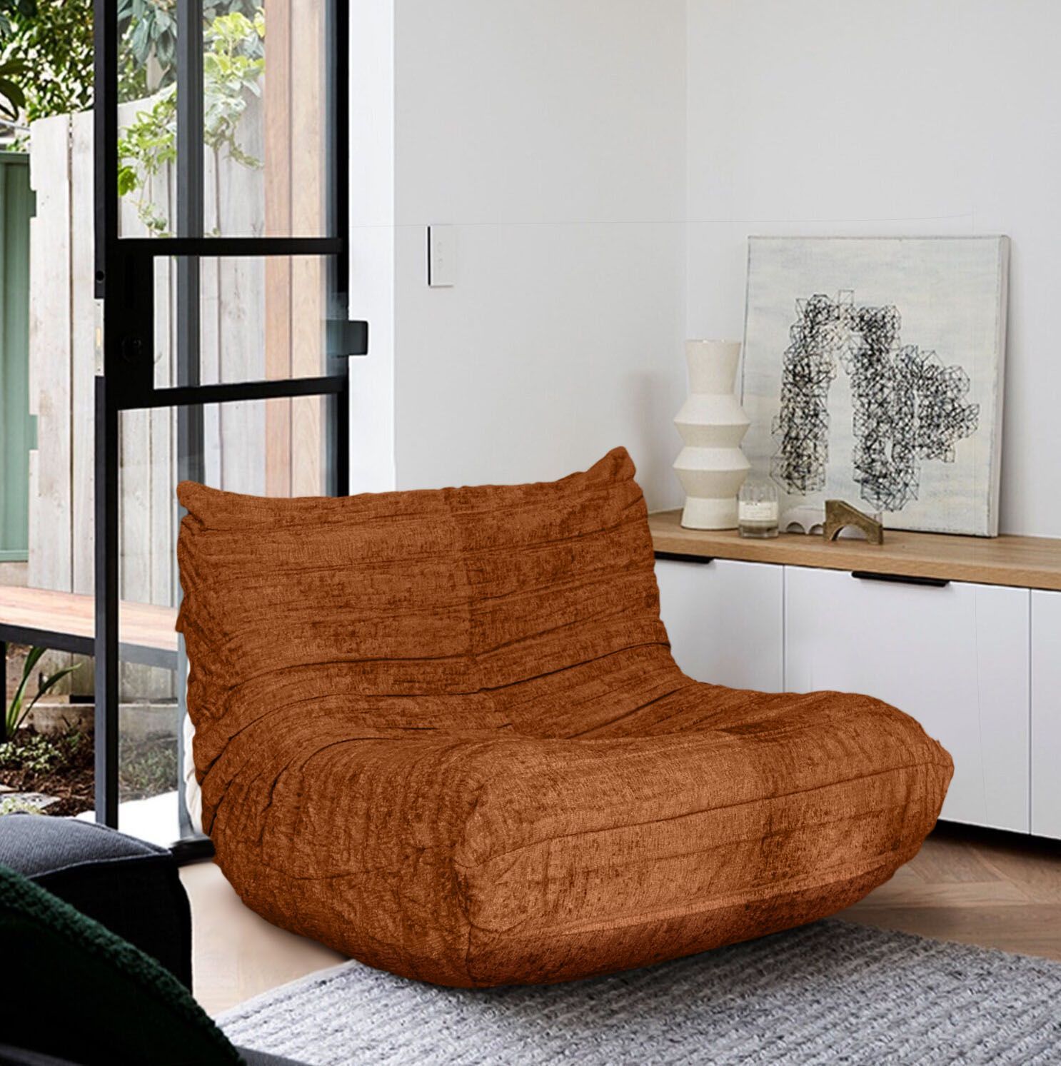 Unwind in ultimate style with the Lunaro Luxe Bean Lounger, a plush, oversized designer bean bag chair available in rich Burnt Orange and Goldish Brown fabrics. Perfect for relaxed, modern living.